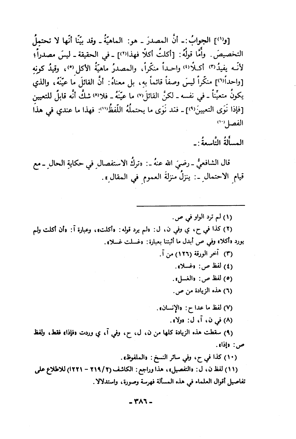 والجواب أن المصدر هو الماهية وقد بينا أنها لا تحتمل التخصيص وأما قوله أكلت أكلا فهذا في الحقيقة ليس مصدرا لأنه يفيد أكلا واحدا منكرا والمصدر ماهية الأكل وقيد كونه واحدا منكرا ليس وصفا قائما به بل معناه أن القائل ما عينه والذي يكون متعينا في نفسه لكن القائل ما عينه فلا شك أنه قابل للتعيين فإذا نوى التعيين فقد نوى ما يحتمله اللفظ فهذا ما عندي في هذا الفصل المسألة التاسعة قال الشافعي رضي الله عنه ترك الاستفصال في حكاية الحال مع قيام الاحتمال ينزل منزلة العموم في المقال