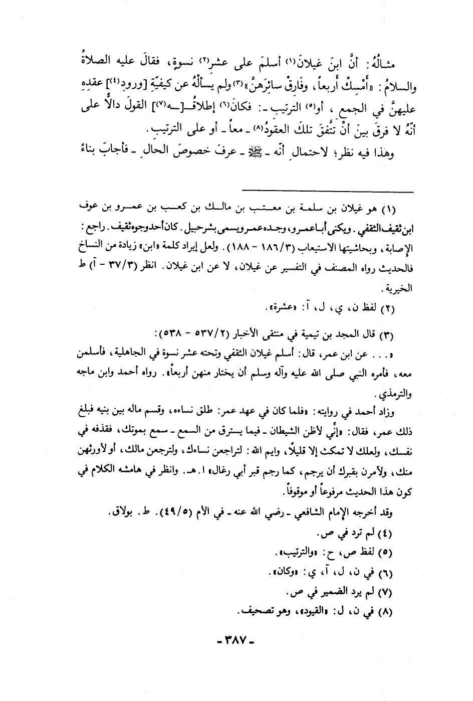 مثاله أن ابن غيلان أسلم على عشر نسوة فقال عليه الصلاة والسلام أمسك أربعا وفارق سائرهن ولم يسأله عن كيفية ورود عقده عليهن في الجمع أو الترتيب فكان إطلاقه القول دالا على أنه لا فرق بين أن تتفق تلك العقود معا أو على الترتيب وهذا فيه نظر لاحتمال أنه ص عرف خصوص الحال فأجاب بناء