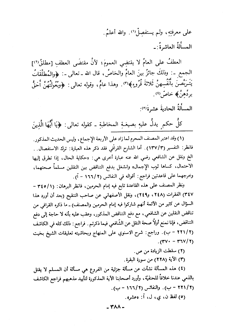 على معرفته ولم يستفصل والله أعلم المسألة العاشرة العطف على العام لا يقتضي العموم لأن مقتضى العطف مطلق الجمع وذلك جائز بين العام والخاص قال الله تعالى والمطلقات يتربصن بأنفسهن ثلاثة قروء وهذا عام وقوله تعالى وبعولتهن أحق بردهن خاص المسألة الحادية عشرة كل حكم يدل عليه بصيغة المخاطبة كقوله تعالى يأيها الذين