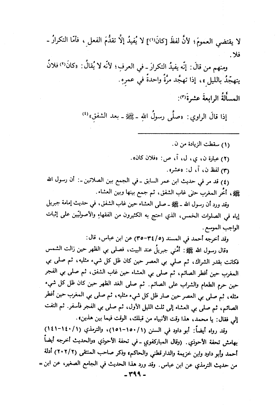 لا يقتضي العموم لأن لفظ كان لا يفيد إلا تقدم الفعل فأما التكرار فلا ومنهم من قال إنه يفيد التكرار في العرف لأنه لا يقال كان فلان يتهجد بالليل إذا تهجد مرة واحدة في عمره المسألة الرابعة عشرة إذا قال الراوي صلى ص بعد الشفق