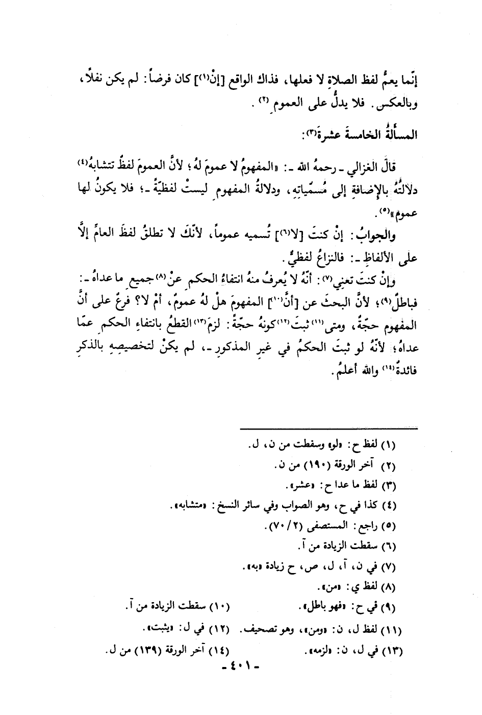 إنما يعم لفظ الصلاة لا فعلها فذاك الواقع إن كان فرضا لم يكن نفلا وبالعكس فلا يدل على العموم المسألة الخامسة عشرة قال الغزالي رحمه الله المفهوم لا عموم له لأن العموم لفظ تتشابه دلالته بالإضافة إلى مسمياته ودلالة المفهوم ليست لفظية فلا يكون لها عموم والجواب إن كنت لا تسميه عموما لأنك لا تطلق لفظ العام إلا على الألفاظ فالنزاع لفظي وإن كنت تعني أنه لا يعرف منه انتفاء الحكم عن جميع ما عداه فباطل لأن البحث عن أن المفهوم هل له عموم أم لا فرع على أن المفهوم حجة ومتى ثبت كونه حجة لزم القطع بانتفاء الحكم عما عداه لأنه لو ثبت الحكم في غير المذكور لم يكن لتخصيصه بالذكر فائدة والله أعلم.
