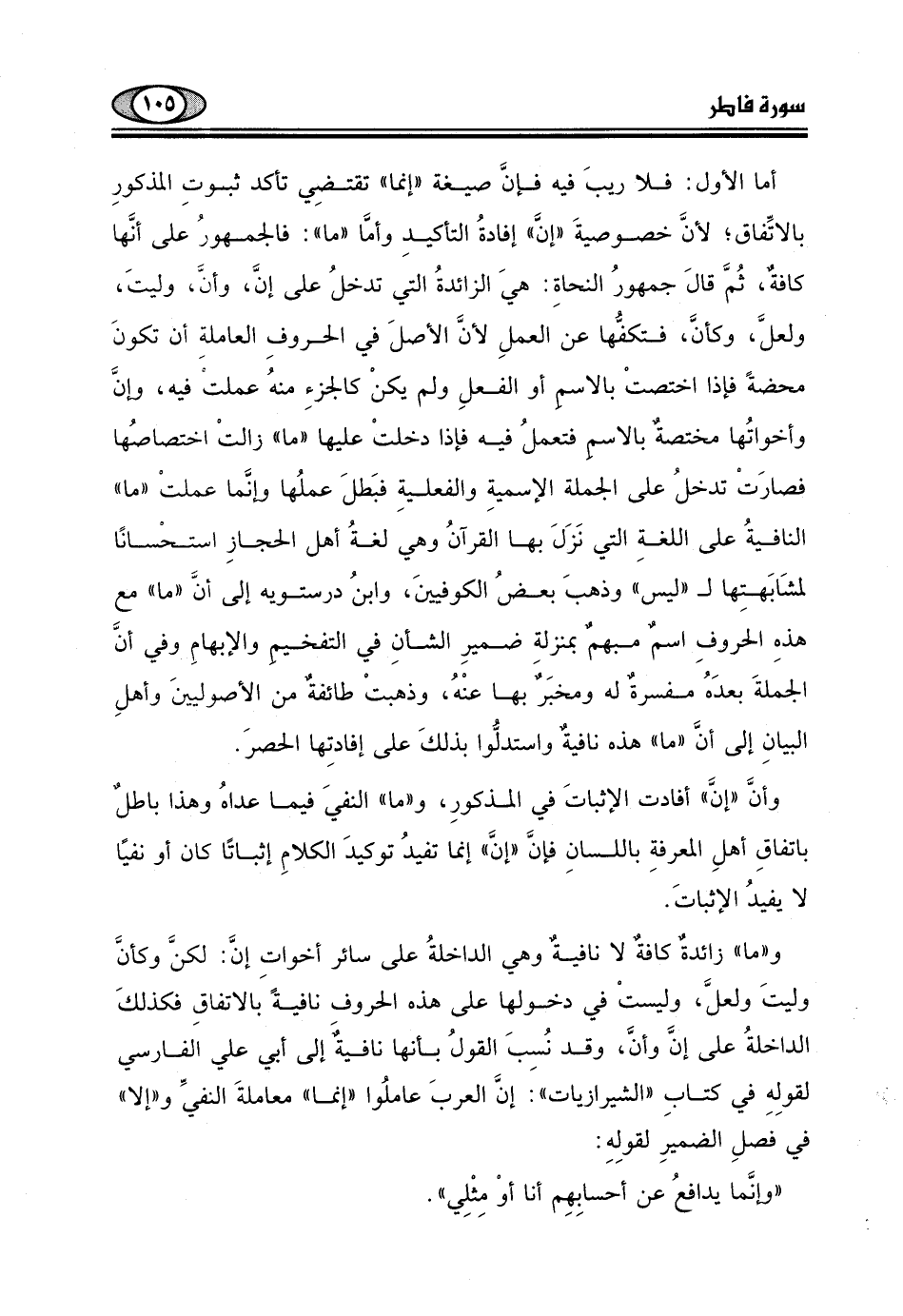 البيانِ إلى أن "ما" هذه نافيةٌ واستدلُّوا بذلكَ على إفادتِها الحصرَ.