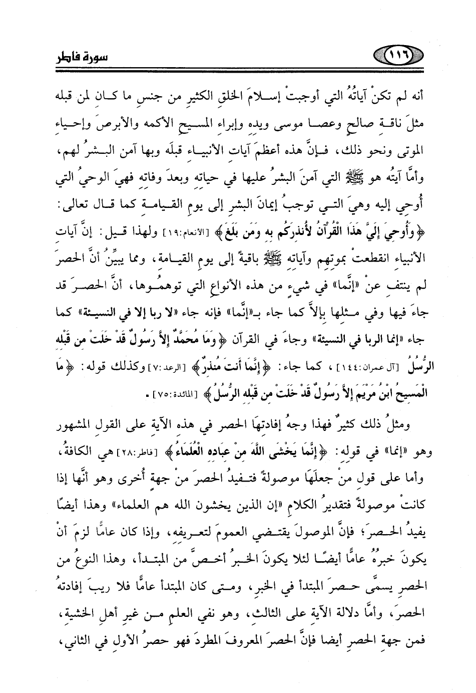 ولهذا قيل: إنَّ آياتِ الأنبياءِ انقطعتْ بموتِهِم وآياتِهِ - صلى الله عليه وسلم - باقيةً إلى يومِ القيامةِ، ومما يبيِّن أنَّ الحصرَ لم ينتفِ عنْ "إنَّما" في شيء من هذه الأنواع التي توهمُوها، أنَّ الحصرَ قد جاءَ فيها وفي مثلِها بِإلاَّ كما جاء بـ "إنَّما" فإنه جاء "لا ربا إلا في النسيئة"
