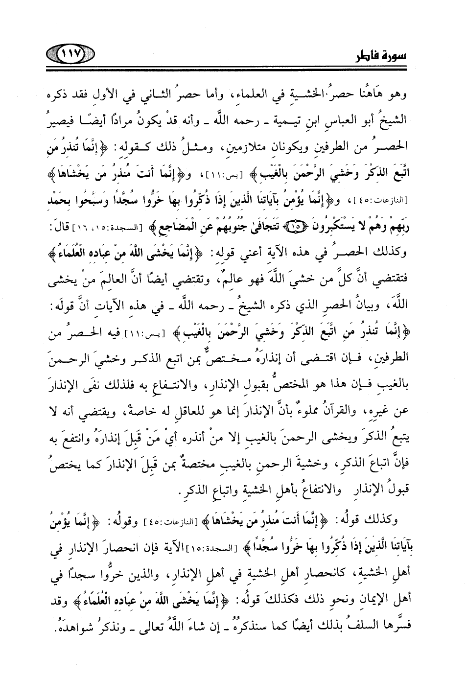 فإن انحصارَ الإنذارِ في أهلِ الخشيةِ، كانحصارِ أهلِ الخشيةِ في أهلِ الإنذارِ، والذين خرُّوا سجدًا في أهل الإيمانِ ونحوِ ذلك فكذلكَ قولُه: