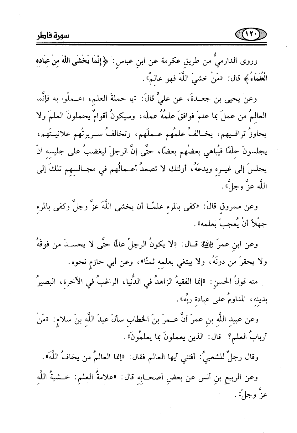 وروى الدارميُّ من طريقِ عكرمة عن ابنِ عباسٍ: (إِنَّمَا يَخْشَى اللَّهَ مِنْ عِبَادِهِ