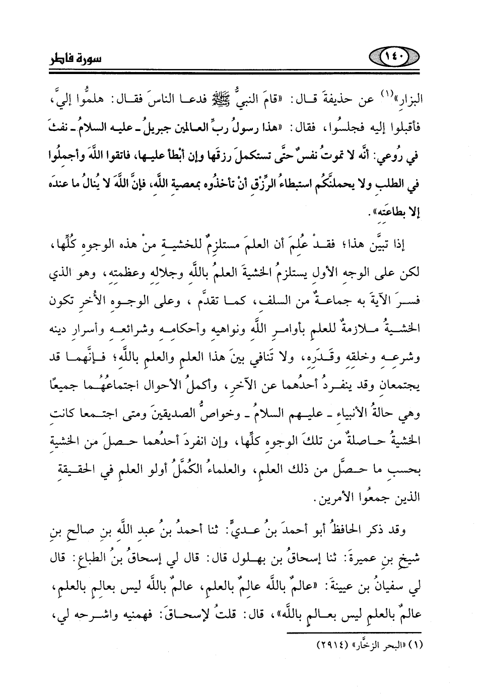 لكن على الوجهِ الأولِ يستلزمُ الخشيةَ العلمُ باللَّهِ وجلالِهِ وعظمتِهِ، وهو الذي فسرَ الآيةَ به جماعةٌ من السلفِ، كما تقدَّم، وعلى الوجوهِ الأُخرِ تكون الخشيةُ ملازمةٌ للعلم بأوامرِ اللهِ ونواهيهِ وأحكامِهِ وشرائعِهِ وأسرارِ دينه