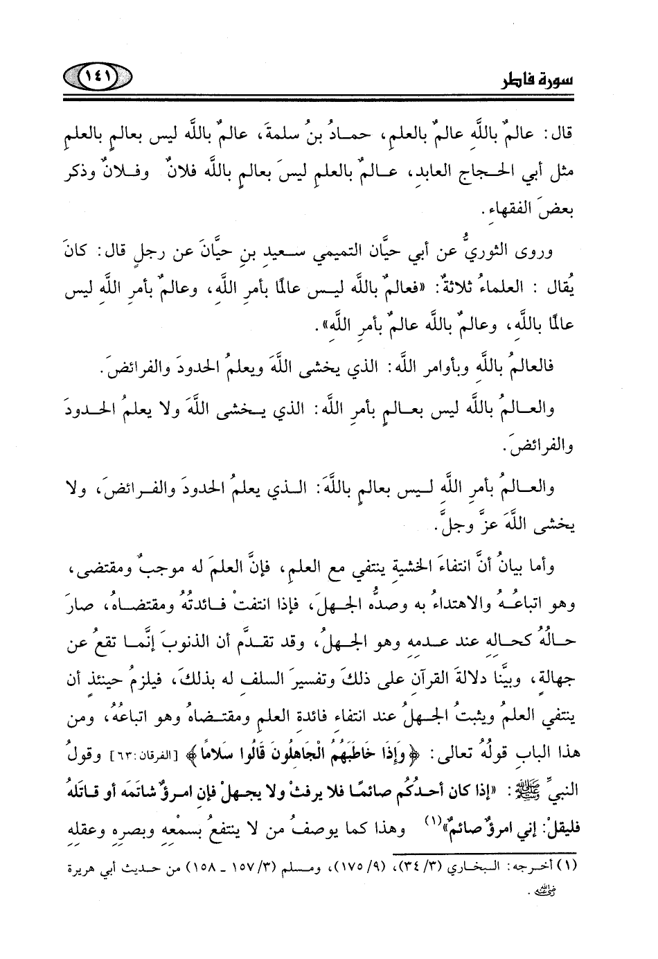والعالمُ باللَّه ليس بعالم بأمرِ اللَّه: الذي يخشى اللَّهَ ولا يعلمُ الحدودَ