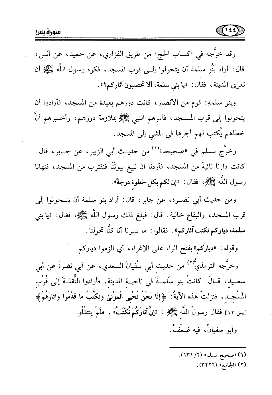 المَسْجِدِ، فنزلتْ هذه الآية ُ: (إِنَّا نَحْنُ نُحْيِ الْمَوْتَى وَنَكْتُبُ مَا قَدَّمُوا وَآثَارَهُمْ) فقال رسولُ اللَّهِ - صلى الله عليه وسلم -: