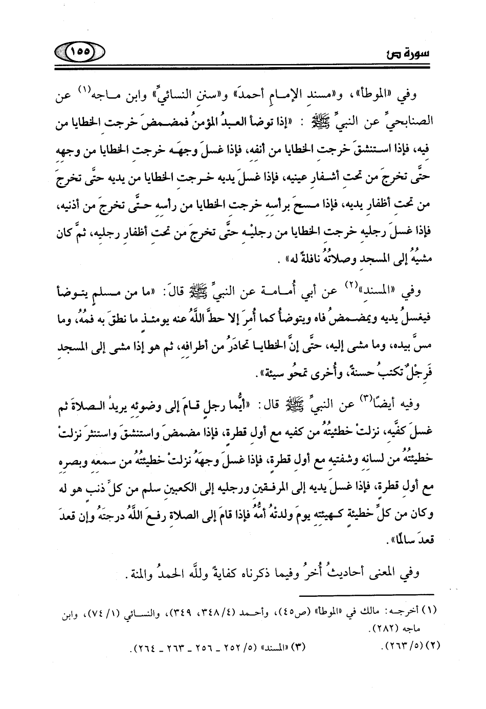 "ما من مسلمٍ يتوضأ فيغسلُ يديه ويمضمضُ فاه ويتوضأ كما أُمِرَ إلا حطَّ اللَهُ عنه يومئذ ما نطقَ به فمُهُ، وما مسَّ بيده، وما مشى إليه، حتَّى إنَّ الخطايا تحادَرُ من أطرافِهِ، ثم هو إذا مشى إلى المسجدِ فَرِجْل تكتبُ حسنةً، وأُخرى تمحُو سيئة".