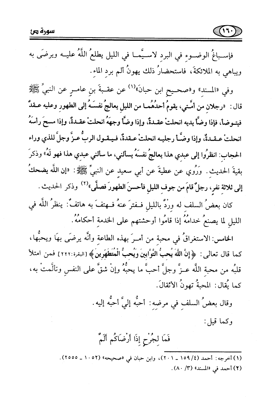 وفي "المسندِ" و"صحيح ابن حبانَ " عن عقبةَ بنِ عامرٍ عن النبي - صلى الله عليه وسلم - قال: "رجلانِ من أُمَّتي، يقومُ أحدُهُما من الليلِ يعالجُ نفسَهُ إلى الطهورِ وعليه عقدٌ فيتوضأ، فإذا وضَّأ يديه انحلتْ عقدة، وإذا وضأ وجهَهُ انحلتْ عقدة، وإذا مسحَ رأسَهُ انحلتْ عقدة، وإذا وضَّأ رجليه انحلتْ عقدة، فيقول الرب عزَّ وجل للذي وراء الحجابِ: انظرُوا إلى عبدِي هذا يعالجُ نفسَهُ يسألني، ما سألني عبدِي هذا فهو لَهُ "