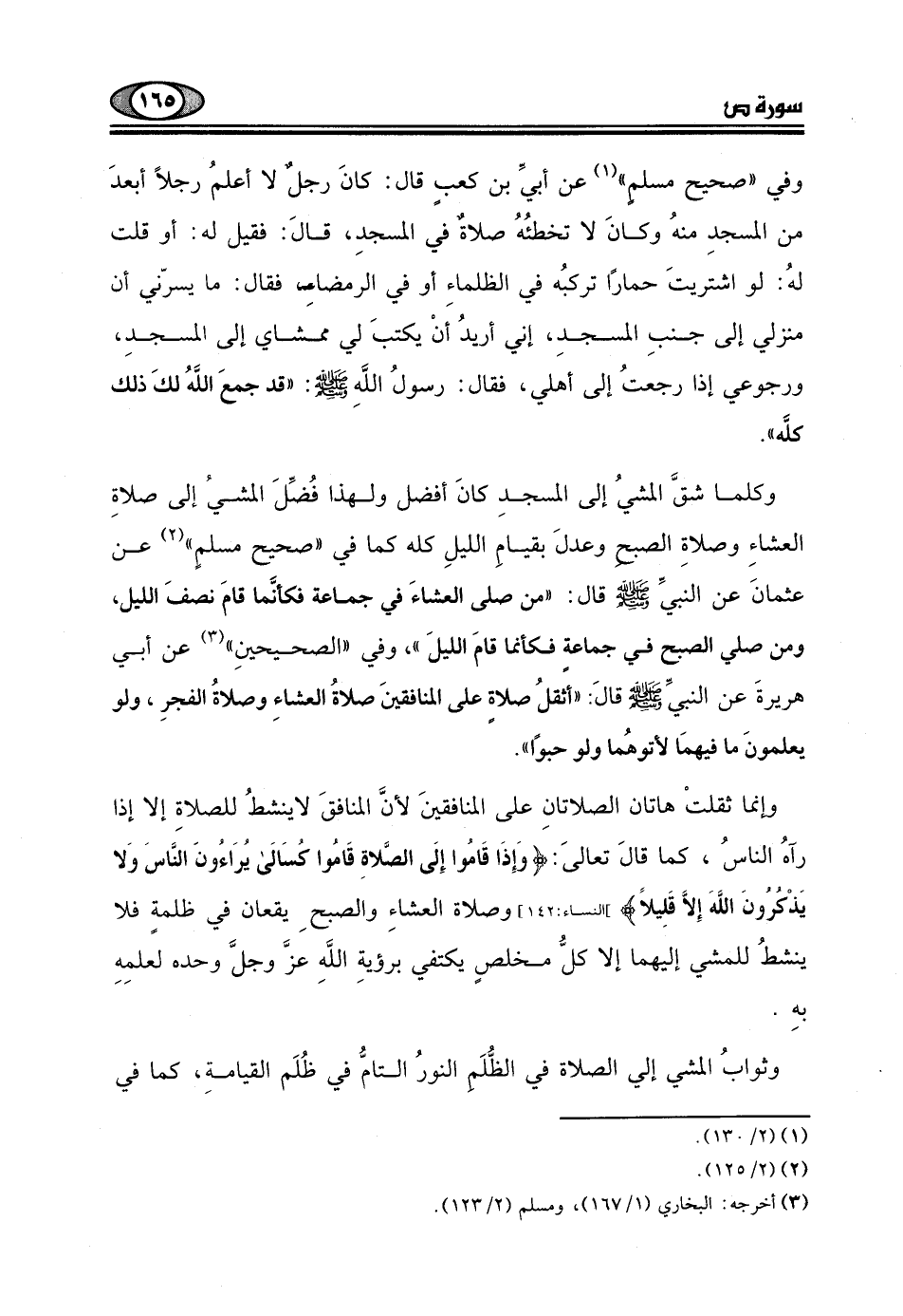 وصلاة العشاءِ والصبحِ يقعان في ظلمةٍ فلا ينشطُ للمشي إليهما إلا كلُّ مخلص يكتفي برؤيةِ اللَّهِ عزَّ وجلَّ وحده لعلمِهِ