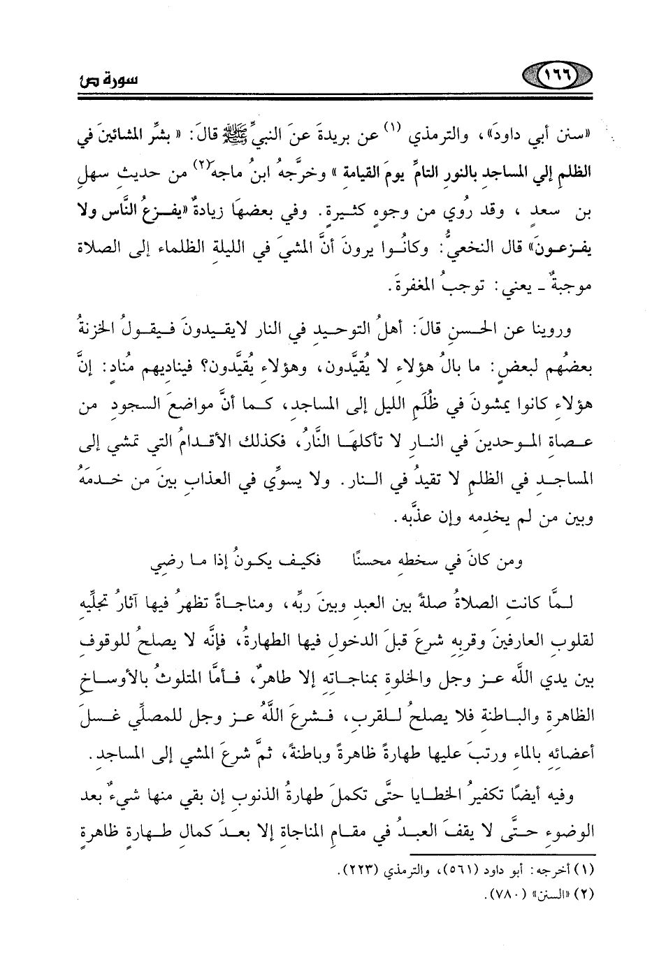 فينادِيهم مُنادٍ: إنَّ هؤلاءِ كانوا يمشونَ في ظُلَم الليل إلى المساجدِ، كما أنَّ مواضعَ السجودِ من عصاةِ الموحدينَ في النارِ لا تأكلهَا النَّارُ، فكذلك الأقدامُ التي تمشي إلى المساجدِ في الظلم لا تقيدُ في النار.