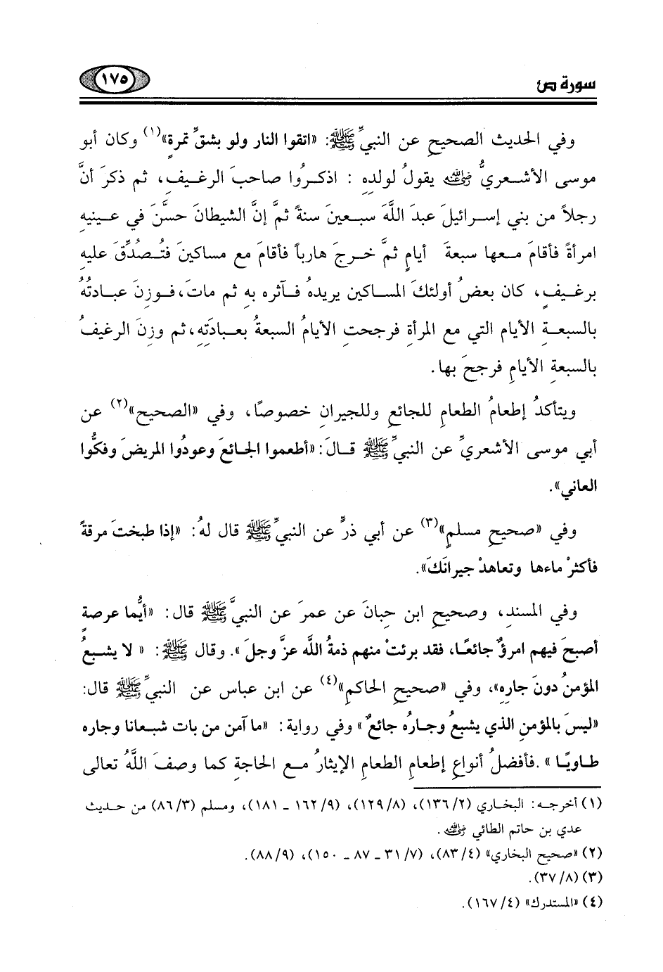 ويتأكدُ إطعامُ الطعامِ للجائع وللجيرانِ خصوصًا، وفي "الصحيح " عن