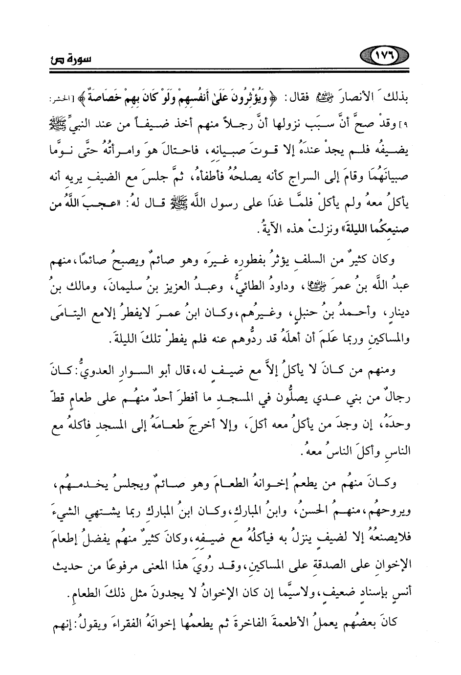 ويروحهُم، منهمُ الحسنُ، وابنُ المباركِ، وكان ابنُ المباركِ ربما يشتهي الشيءَ فلا يصنعُهُ إلا لضيفٍ ينزلُ به فيأكلُهُ مع ضيفِهِ، وكانَ كثير منهُم يفضلُ إطعامَ الإخوانِ على الصدقةِ على المساكينِ.