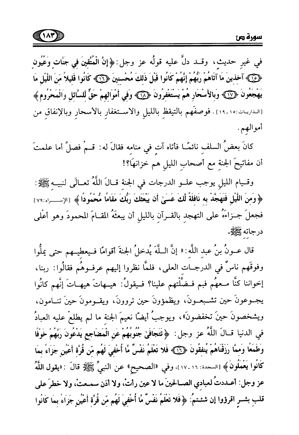 ويوجبُ أيضًا نعيمَ الجنةِ ما لم يطلعْ عليه العبادُ في الدنيا قالَ اللَّهُ عز وجل: (تَتَجَافَى جُنُوبُهُمْ عَنِ الْمَضَاجِعِ يَدْعُونَ رَبَّهُمْ خَوْفًا وَطَمَعًا وَمِمَّا رَزَقْنَاهُمْ يُنْفِقُونَ (16) فَلَا تَعْلَمُ نَفْسٌ مَا أُخْفِيَ لَهُمْ مِنْ قُرَّةِ أَعْيُنٍ جَزَاءً بِمَا كَانُوا يَعْمَلُونَ (17) .