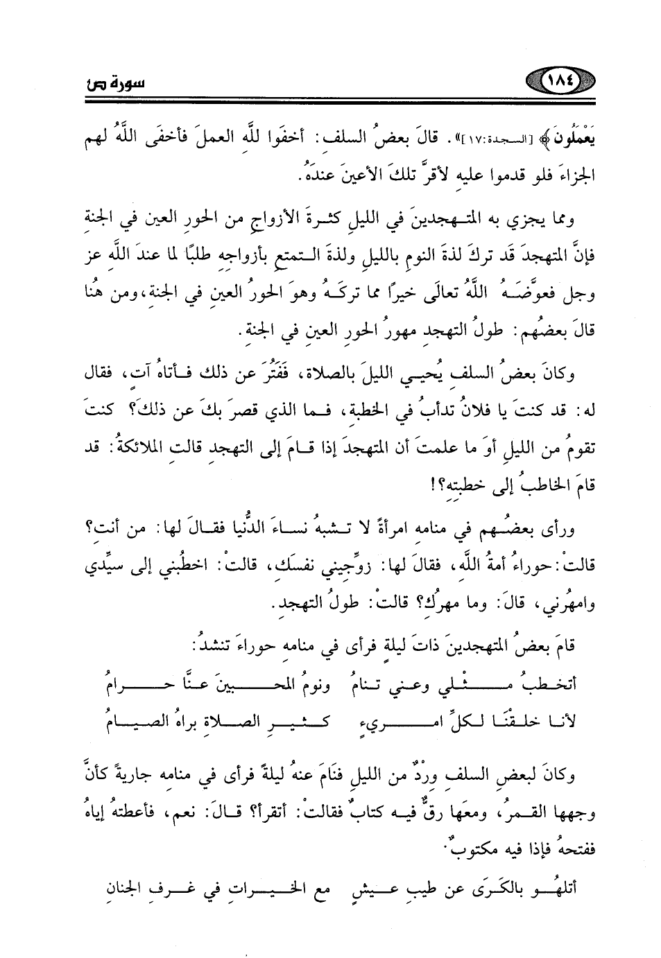 قامَ بعضُ المتهجدينَ ذاتَ ليلةٍ فرأى في منامهِ حوراءَ تنشدُ: