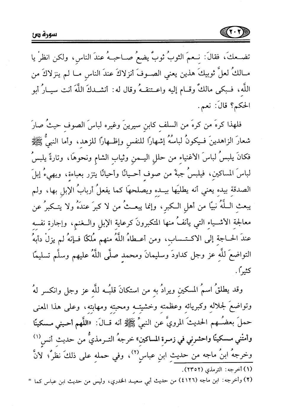 شعارَ الزاهدينَ فيكونُ لباسُهُ إشهارًا للنفسِ وإظهارًا للزهدِ، وأما النبي - صلى الله عليه وسلم - فكانَ يلبسُ لباسَ الأغنياءِ من حللِ اليمنِ وثيابِ الشامِ ونحوهَا، وتارةً يلبسُ لباسَ المساكينِ، فيلبسُ جبةً من صوفٍ أحيانًا وأحيانًا يتزر بعباءه، ويهيئُ إبلَ الصدقةِ بيدهِ يعني أنه يطليَها بيدِهِ ويصلحهَا كما يفعلُ أربابُ الإبلِ بها، ولم يبعثِ اللَّهُ نبيًا من أهلِ الكبرِ، وإنَّما يبعثُ من لا كبرَ عندَهُ ولا يتكبرُ عن معالجةِ الأشياءِ التي يأنفُ منها المتكبرونَ كرعايةِ الإبلِ والغنم، وإجارةِ نفسِهِ عندَ الحاجةِ إلى الاكتسابِ، ومن أعطاهُ اللَّهُ منهم مُلكًا فإنهُ لم يزل دأبهُ التواضعَ للَّهِ عز وجل كداودَ وسليمانَ ومحمدٍ صلَّى اللَّهُ عليهم وسلَّم تسليمًا كثيرًا.