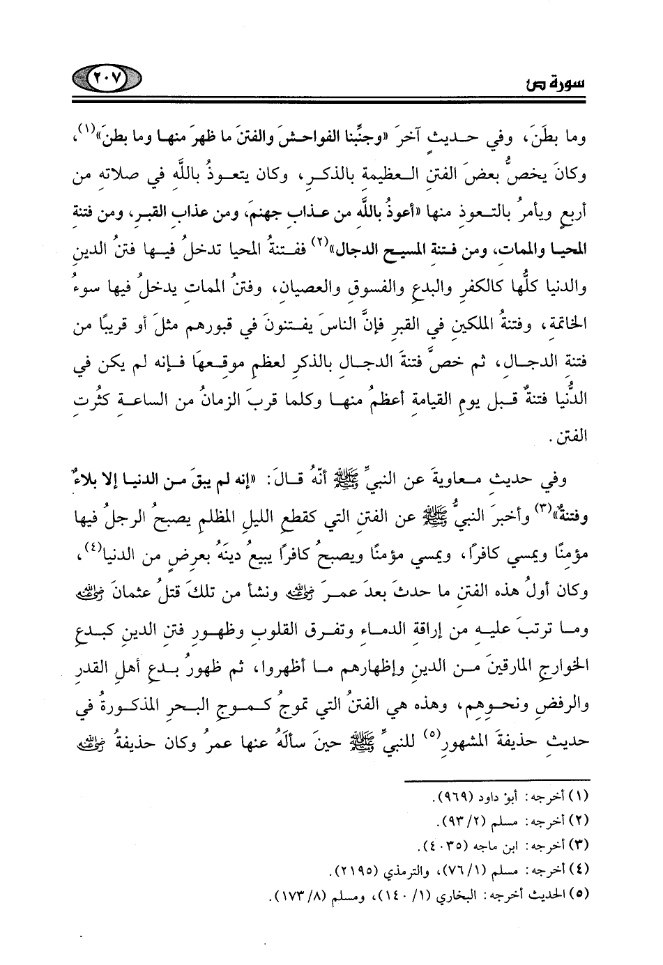 وما بطَنَ، وفي حديثٍ آخرَ "وجنِّبنا الفواحشَ والفتنَ ما ظهرَ منها وما بطنَ "، وكانَ يخصُّ بعضَ الفتنِ العظيمة بالذكرِ، وكان يتعوذُ باللَّهِ في صلاتهِ من