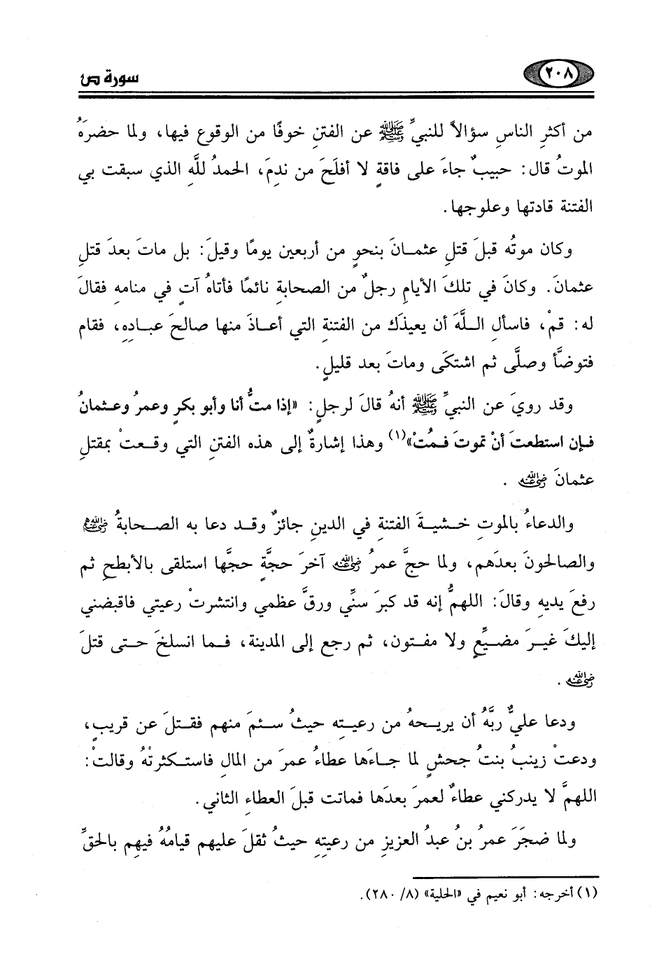 والدعاءُ بالموتِ خشيةَ الفتنةِ في الدينِ جائزٌ وقد دعا به الصحابةُ - رضي الله عنهم - والصالحونَ بعدَهم، ولما حجَّ عمرُ - رضي الله عنه - آخرَ حجَّة حجَّها استلقى بالأبطح ثم رفعَ يديهِ وقالَ: اللهمُّ إنه قد كبرَ سنِّي ورقَّ عظمي وانتشرتْ رعيتي فاقبضني إليكَ غيرَ مُضيِّع ولا مفتون، ثم رجع إلى المدينة، فما انسلخَ حتى قتلَ - رضي الله عنه -.