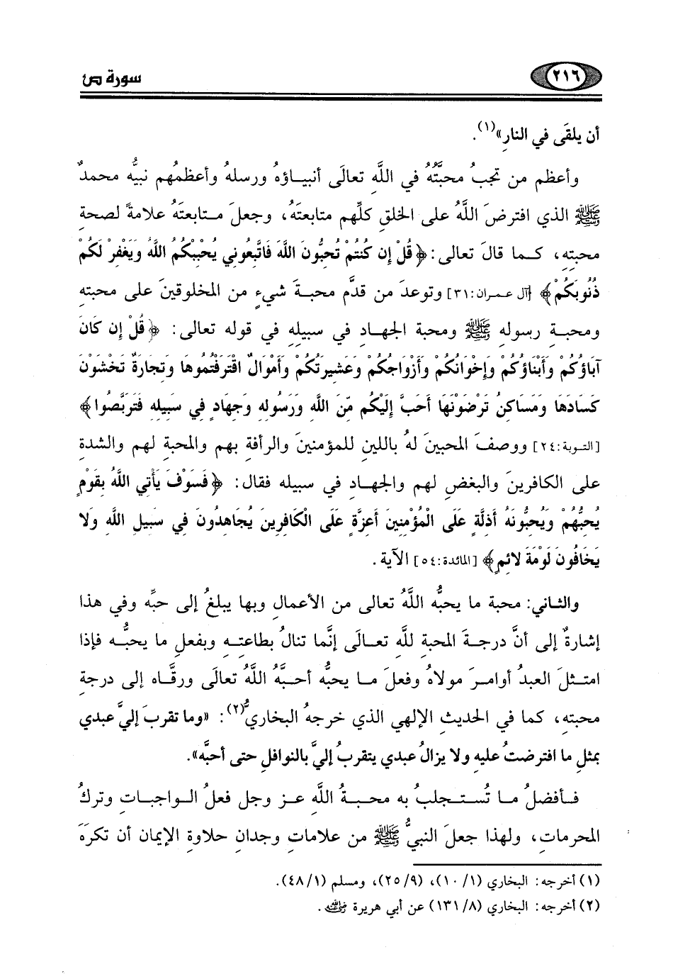 وتوعدَ من قدَّم محبةَ شيءٍ من المخلوقينَ على محبتهِ ومحبةِ رسولهِ - صلى الله عليه وسلم - ومحبة الجهادِ في سبيلِهِ في قوله تعالى: