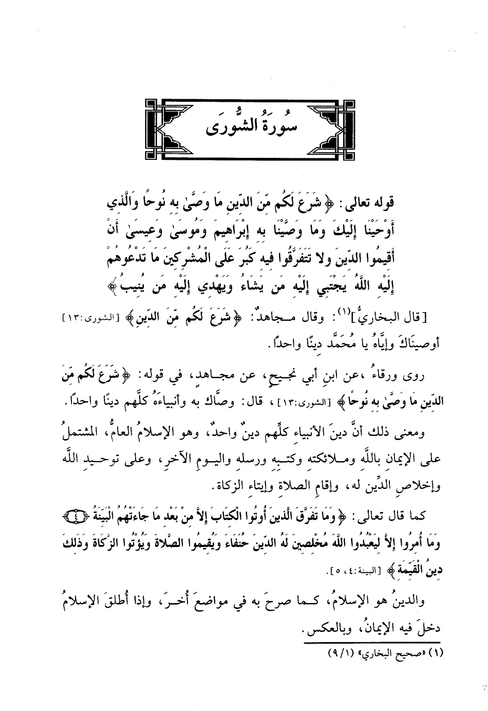قوله تعالى: (شَرَعَ لَكُمْ مِنَ الدِّينِ مَا وَصَّى بِهِ نُوحًا وَالَّذِي أَوْحَيْنَا إِلَيْكَ وَمَا وَصَّيْنَا بِهِ إِبْرَاهِيمَ وَمُوسَى وَعِيسَى أَنْ أَقِيمُوا الدِّينَ وَلَا تَتَفَرَّقُوا فِيهِ كَبُرَ عَلَى الْمُشْرِكِينَ مَا تَدْعُوهُمْ إِلَيْهِ اللَّهُ يَجْتَبِي إِلَيْهِ مَنْ يَشَاءُ وَيَهْدِي إِلَيْهِ مَنْ يُنِيبُ (13)