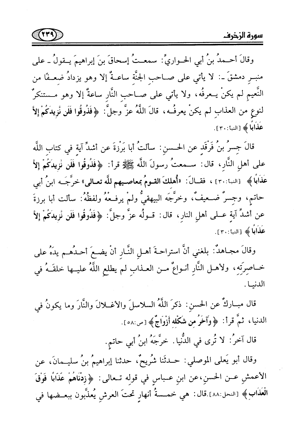 على أهلِ النَارِ، قال: سمعتُ رسولَ اللَّه - صلى الله عليه وسلم - قرأ: (فَذُوقُوا فَلَن نَزِيدَكمْ إِلاَّ عَذَابًا) ، فقالَ: "أُهلِكَ القومُ بمعاصيهم للهِ تعالى" خرَّجَه ابنُ أبي حاتمٍ، وجِسرٌ ضعيفٌ، وخرَّجَه البيهقيُّ ولمْ يرفعْهُ ولفظُهُ: سألت أبا برزةَ عن أشدِّ آيةٍ على أهلِ النارِ، قال: قولُه عزَّ وجلَّ: