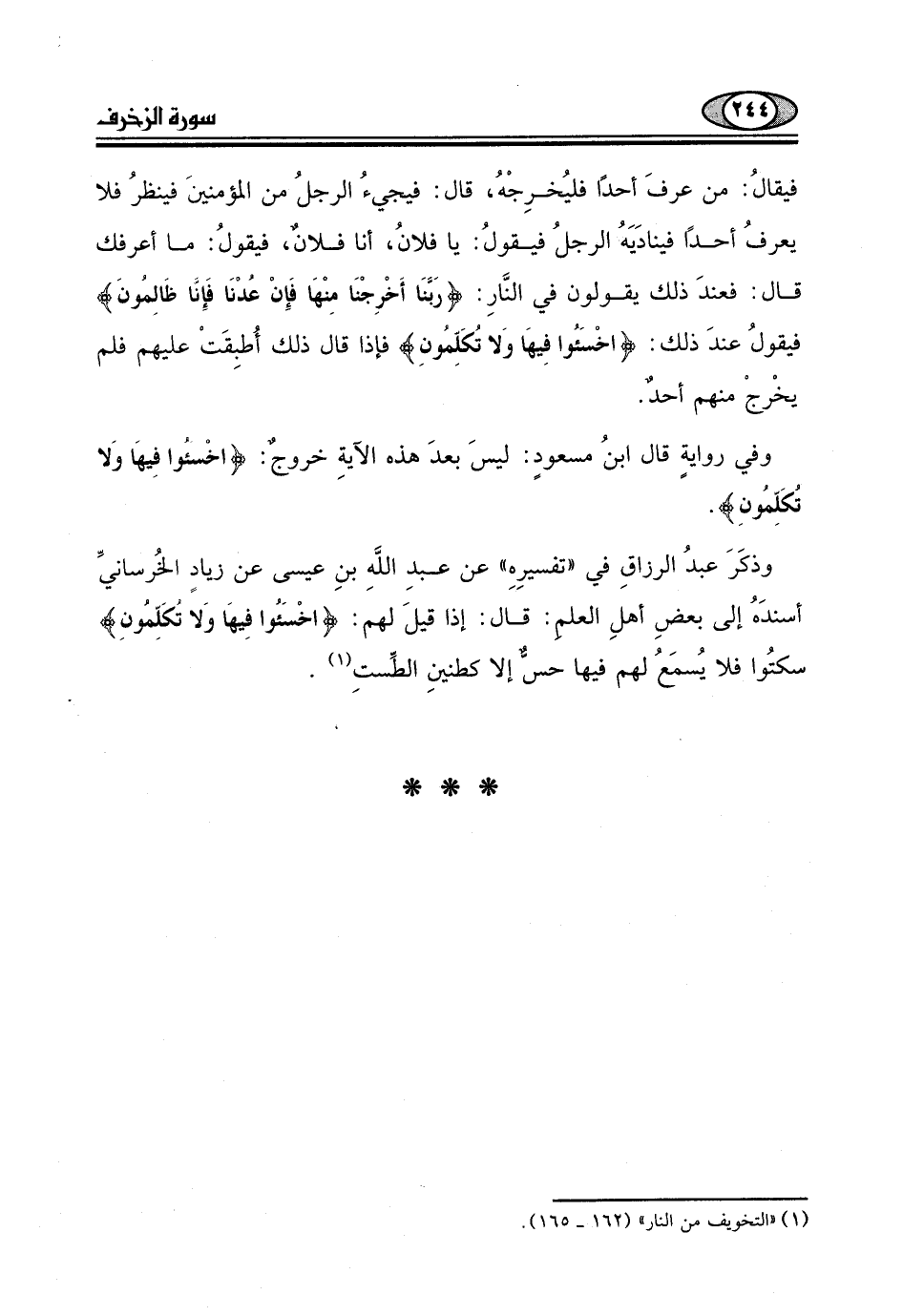 فيقولُ عندَ ذلك: (اخْسَئُوا فِيهَا وَلا تُكَلِّمُونِ)