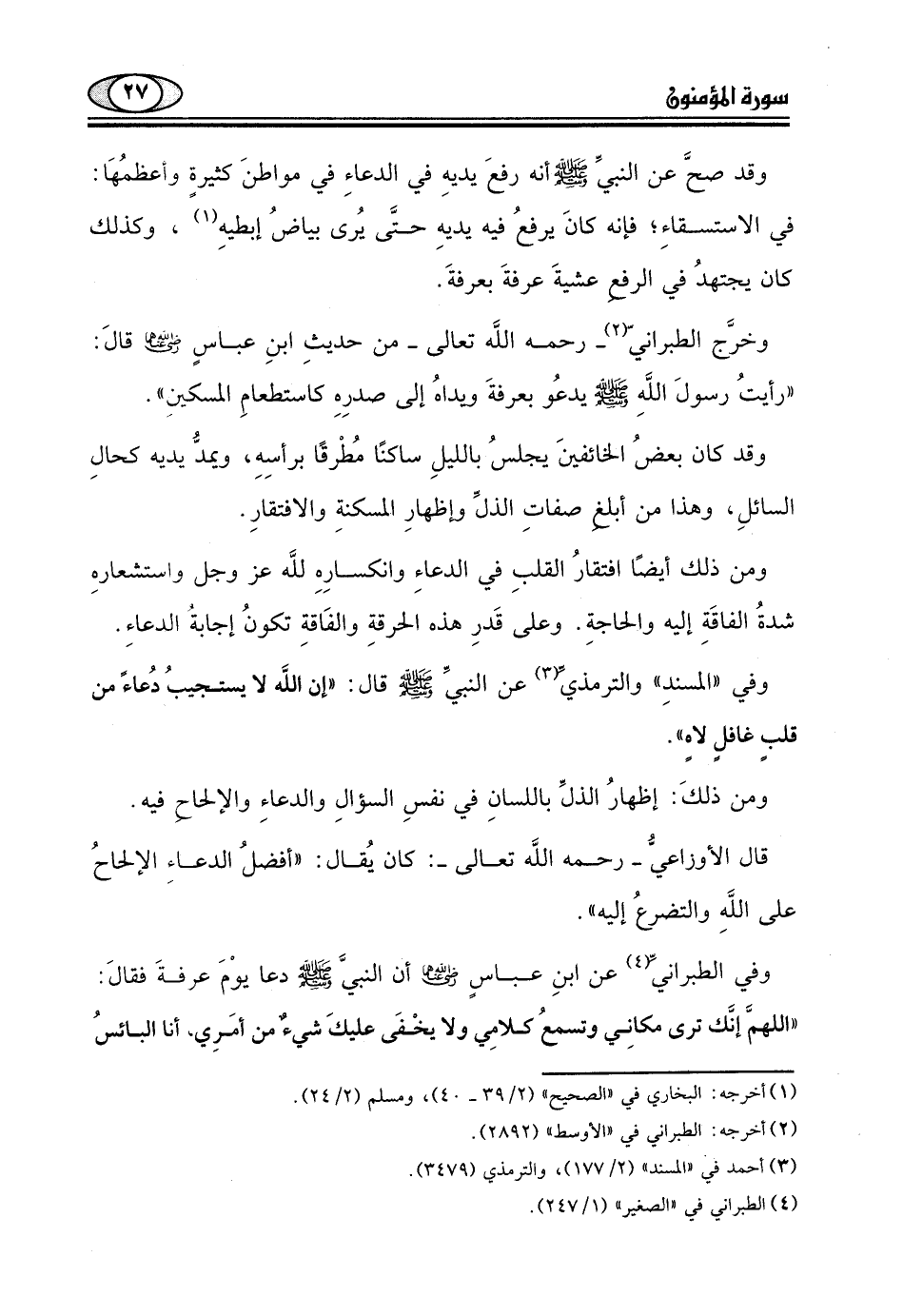 وخرَّج الطبرانيّ رحمه اللَّه تعالى - من حديثِ ابنِ عباسٍ - رضي الله عنهما - قالَ: "رأيتُ رسولَ اللَّه - صلى الله عليه وسلم - يدعُو بعرفةَ ويداهُ إلى صدره كاستطعامِ المسكين ".