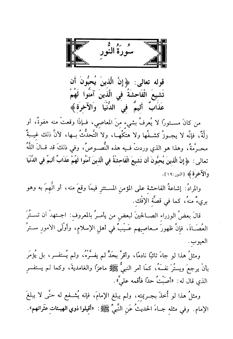 تعالى: (إِنَّ الَّذِينَ يُحِبُّونَ أَنْ تَشِيعَ الْفَاحِشَةُ فِي الَّذِينَ آمَنُوا لَهُمْ عَذَابٌ أَلِيمٌ فِي الدُّنْيَا وَالْآخِرَةِ) .