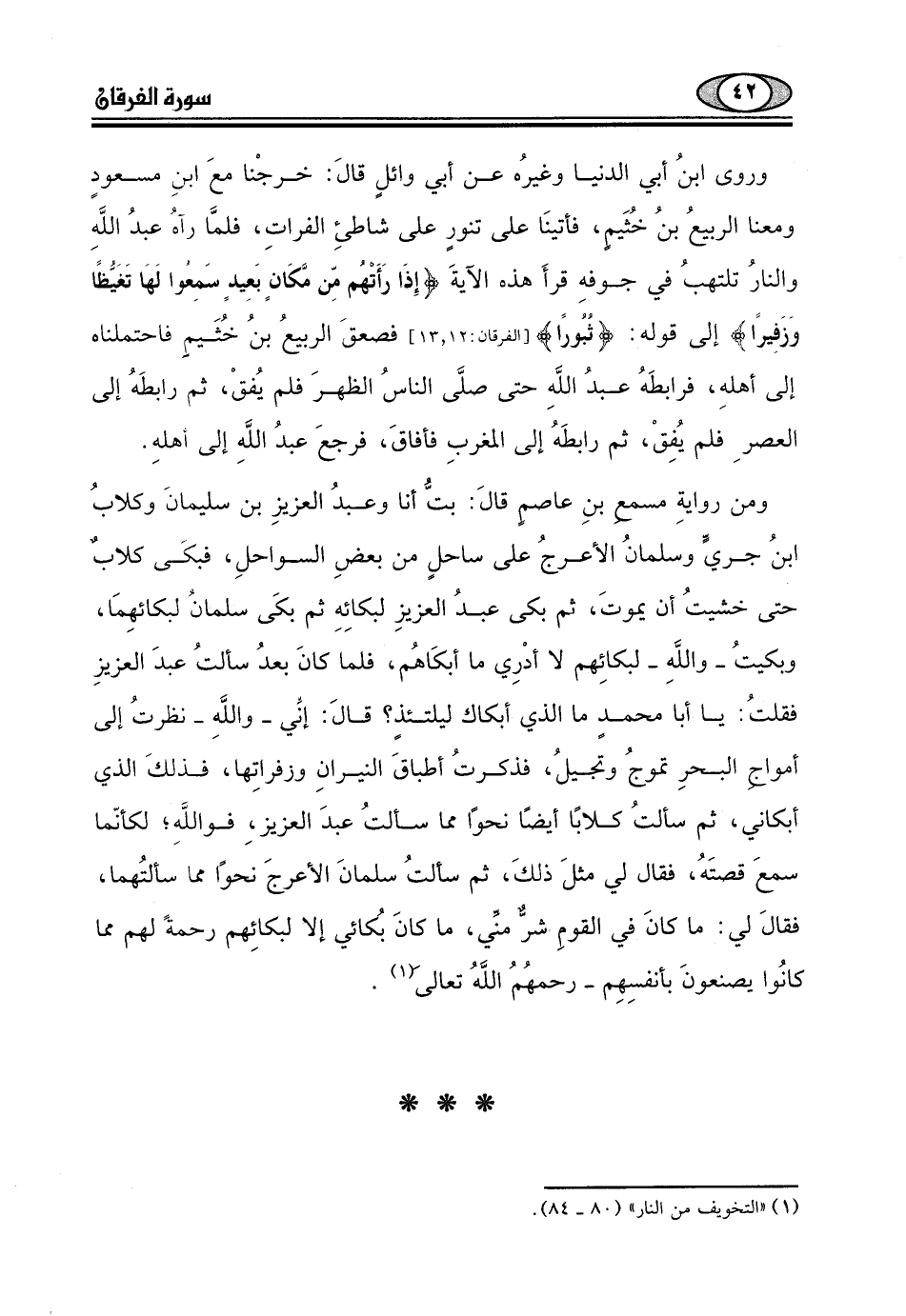 ومعنا الربيعُ بنُ خُثَيم، فأتينَا على تنورٍ على شاطئ الفراتِ، فلمَّا رآهُ عبدُ اللَّهِ والنارُ تلتهبُ في جوفهِ قرأَ هذه الآيةَ (إِذَا رَأَتْهُم مِّن مَّكَانٍ بَعِيدٍ سَمِعوا لَهَا تَغَيُّظًا وَزَفِيرًا) إلى قوله: (ثُبُورًا) ، فصعقَ الربيعُ بنُ خثَيمٍ فاحتملناه