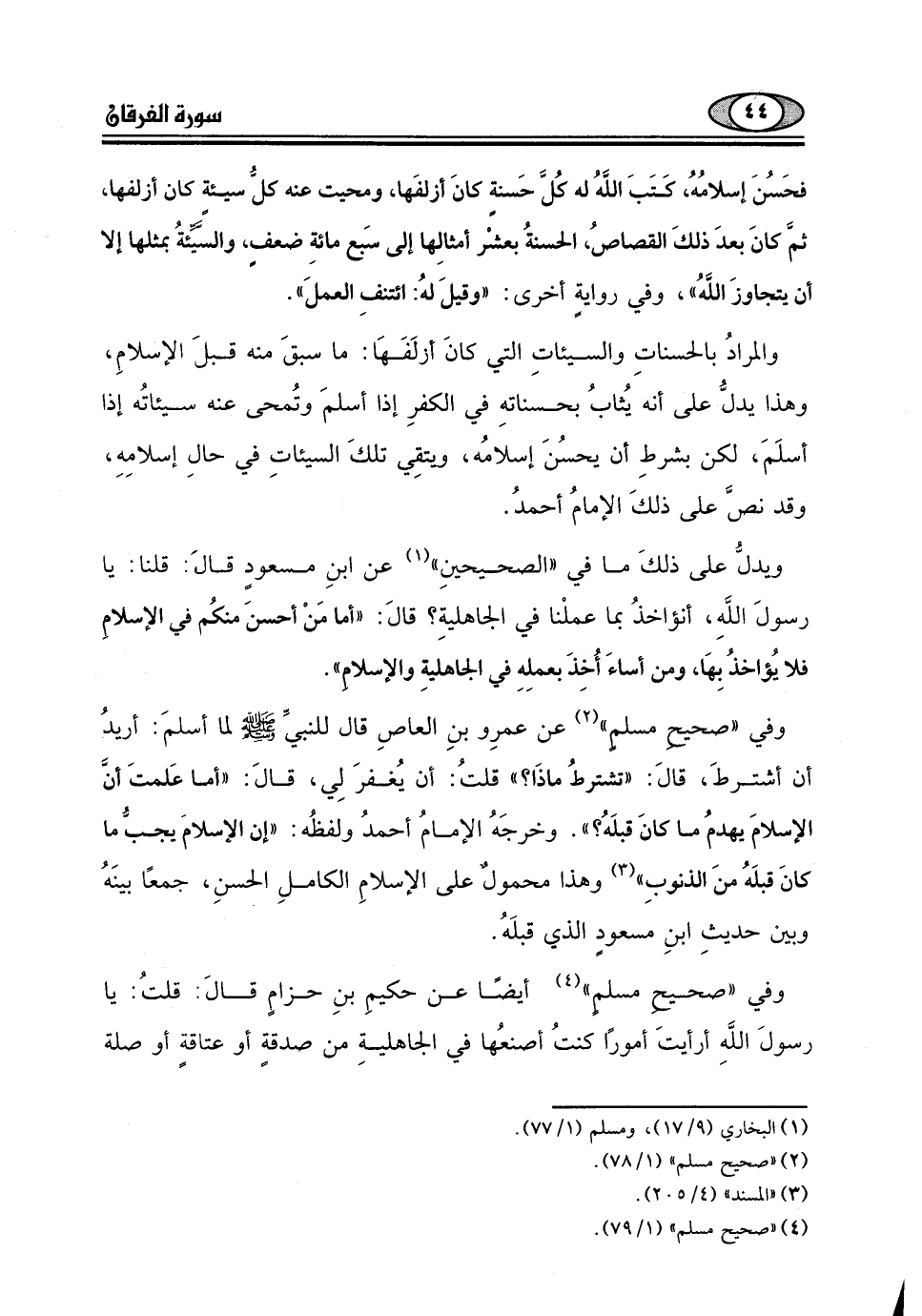 قالَ: "أما مَنْ أحسنَ منكُم في الإسلامِ فلا يُؤاخذُ بِهَا، ومن أساءَ أُخِذَ بعملِهِ في الجاهليةِ والإسلام".