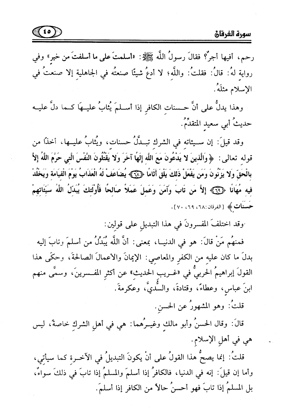 قولهِ تعالى: (وَالَّذِينَ لَا يَدْعُونَ مَعَ اللَّهِ إِلَهًا آخَرَ وَلَا يَقْتُلُونَ النَّفْسَ الَّتِي حَرَّمَ اللَّهُ إِلَّا بِالْحَقِّ وَلَا يَزْنُونَ وَمَنْ يَفْعَلْ ذَلِكَ يَلْقَ أَثَامًا (68) يُضَاعَفْ لَهُ الْعَذَابُ يَوْمَ الْقِيَامَةِ وَيَخْلُدْ فِيهِ مُهَانًا (69) إِلَّا مَنْ تَابَ وَآمَنَ وَعَمِلَ عَمَلًا صَالِحًا فَأُولَئِكَ يُبَدِّلُ اللَّهُ سَيِّئَاتِهِمْ حَسَنَاتٍ) .