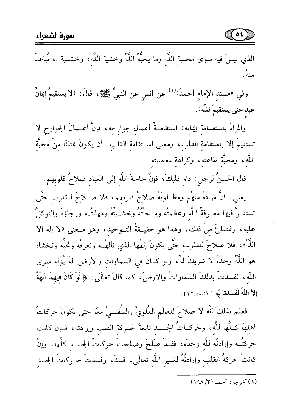 وفي "مسندِ الإمامِ أحمدَ" عن أنس عن النبيِّ - صلى الله عليه وسلم -، قالَ: "لا يستقيمُ إيمانُ عبدٍ حتى يستقيمَ قلبُه ".