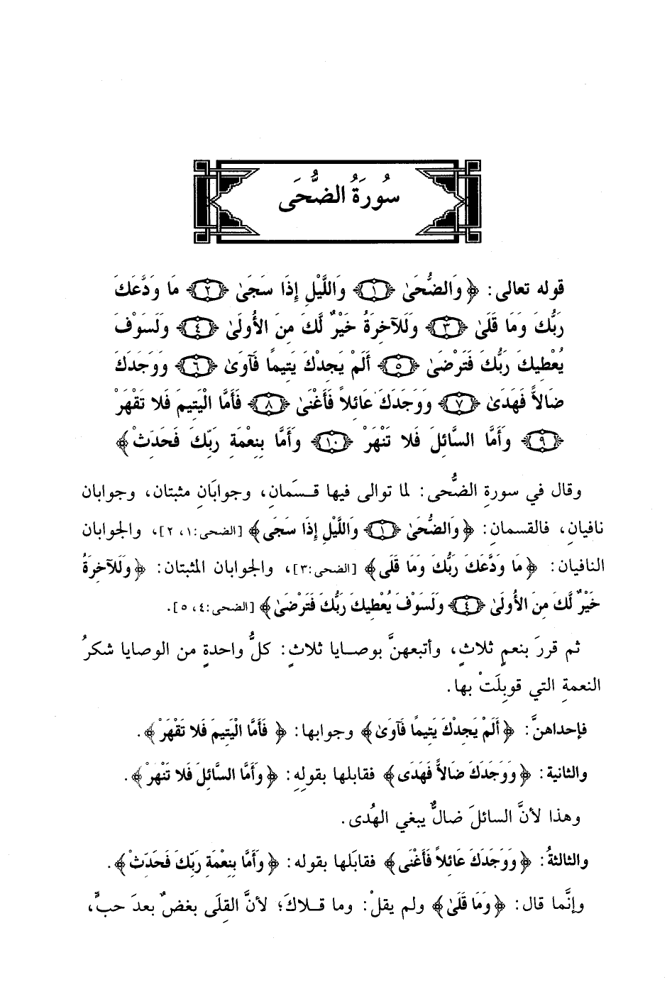 قوله تعالى: (وَالضُّحَى (1) وَاللَّيْلِ إِذَا سَجَى (2) مَا وَدَّعَكَ رَبُّكَ وَمَا قَلَى (3) وَلَلْآخِرَةُ خَيْرٌ لَكَ مِنَ الْأُولَى (4) وَلَسَوْفَ يُعْطِيكَ رَبُّكَ فَتَرْضَى (5) أَلَمْ يَجِدْكَ يَتِيمًا فَآوَى (6) وَوَجَدَكَ ضَالًّا فَهَدَى (7) وَوَجَدَكَ عَائِلًا فَأَغْنَى (8) فَأَمَّا الْيَتِيمَ فَلَا تَقْهَرْ (9) وَأَمَّا السَّائِلَ فَلَا تَنْهَرْ (10) وَأَمَّا بِنِعْمَةِ رَبِّكَ فَحَدِّثْ (11)