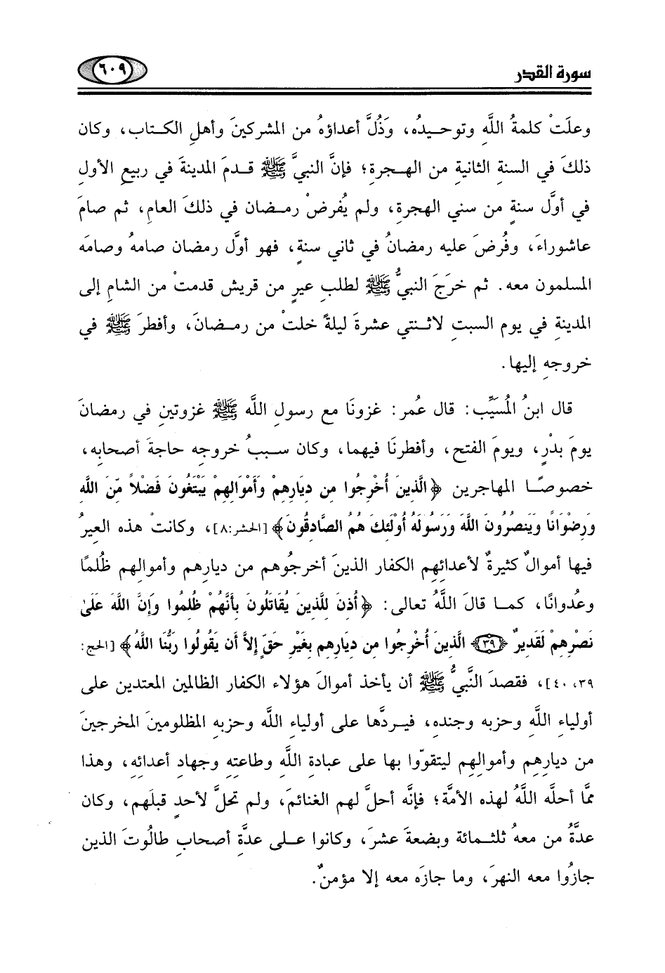 وعلَتْ كلمةُ اللَّهِ وتوحيدُه، وَذُلَّ أعداؤهُ من المشركينَ وأهلِ الكتاب، وكان ذلكَ في السنةِ الثانيةِ من الهجرةِ؛ فإن النبيَّ - صلى الله عليه وسلم - قدمَ المدينةَ في ربيع الأولِ في أول سنةٍ من سني الهجرةِ، ولم يُفرضْ رمضان في ذلكَ العامِ، ثم صامَ عاشوراءَ، وفُرضَ عليه رمضانُ في ثاني سنةٍ، فهو أوَّل رمضان صامهُ وصامَه المسلمون معه.