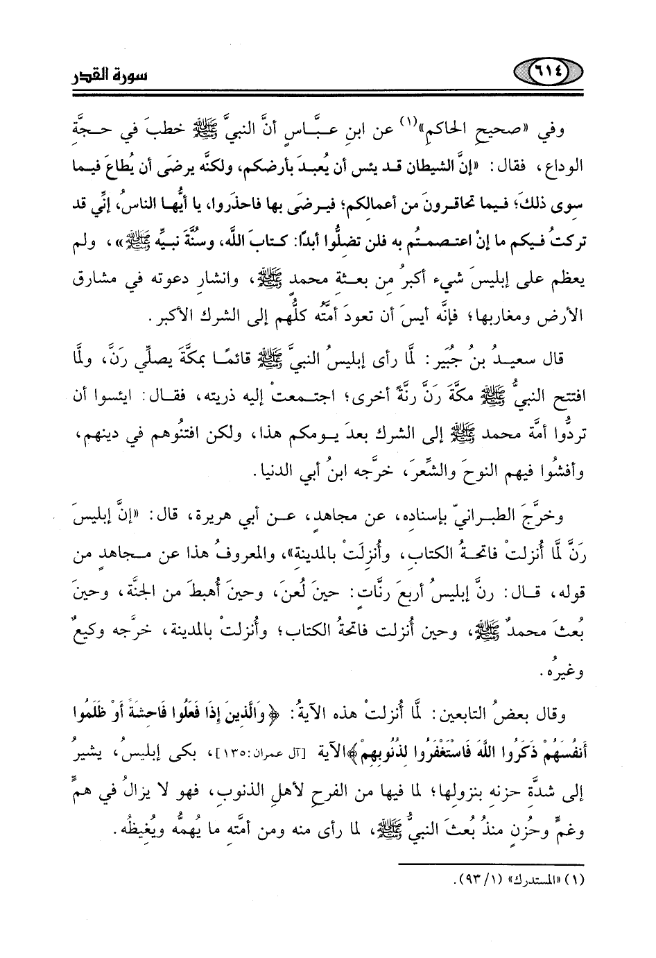 قال سعيدُ بنُ جُبَير: لمَّا رأى إبليسُ النبيَّ - صلى الله عليه وسلم - قائمًا بمكَةَ يصلِّي رَنَّ، ولمَّا افتتح النبيُّ - صلى الله عليه وسلم - مكَّةَ رَنَّ رنَّةً أخرى؛ اجتمعتْ إليه ذريته، فقال: ايئسوا أن تردوا أمَّة محمد - صلى الله عليه وسلم - إلى الشرك بعدَ يومكم هذا، ولكن افتنُوهم في دينهم.