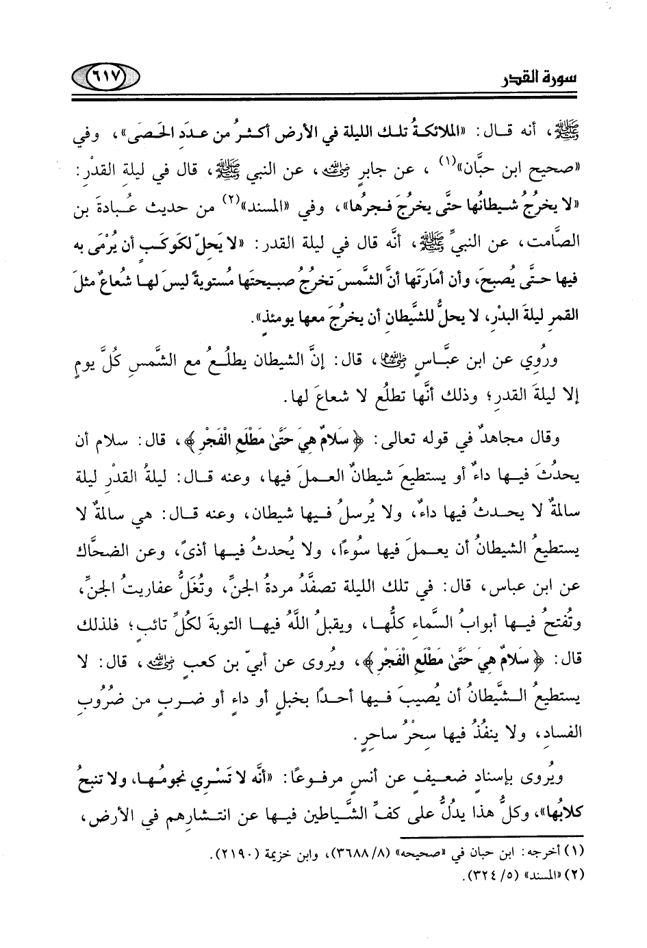 وعن الضحَّاك عن ابن عباس، قال: في تلك الليلة تصفدُ مردةُ الجنِّ، وتُغَلُّ عفاريتُ الجنِّ، وتُفتحُ فيها أبوابُ السماءِ كلُّها، ويقبلُ اللَّهُ فيها التوبةَ لكُلِّ تائبٍ؛ فلذلك قال: (سَلامٌ هِيَ حَتَى مَطْلَعِ الْفَجْرِ) .