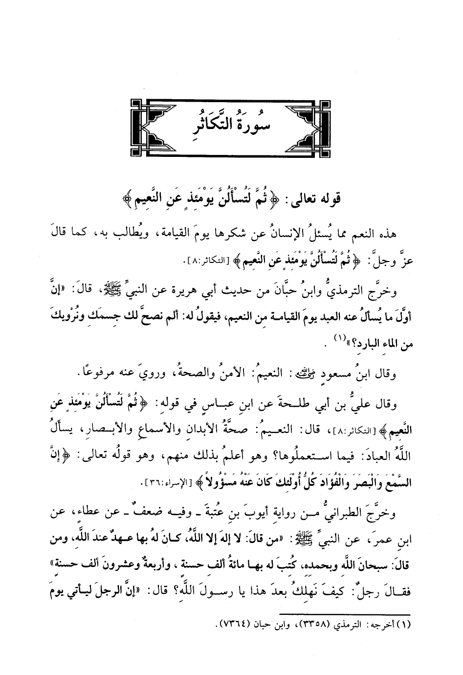 عزَّ وجلَّ: (ثُمَّ لَتُسْأَلُنَّ يَوْمَئِذٍ عَنِ النَّعِيمِ (8) .