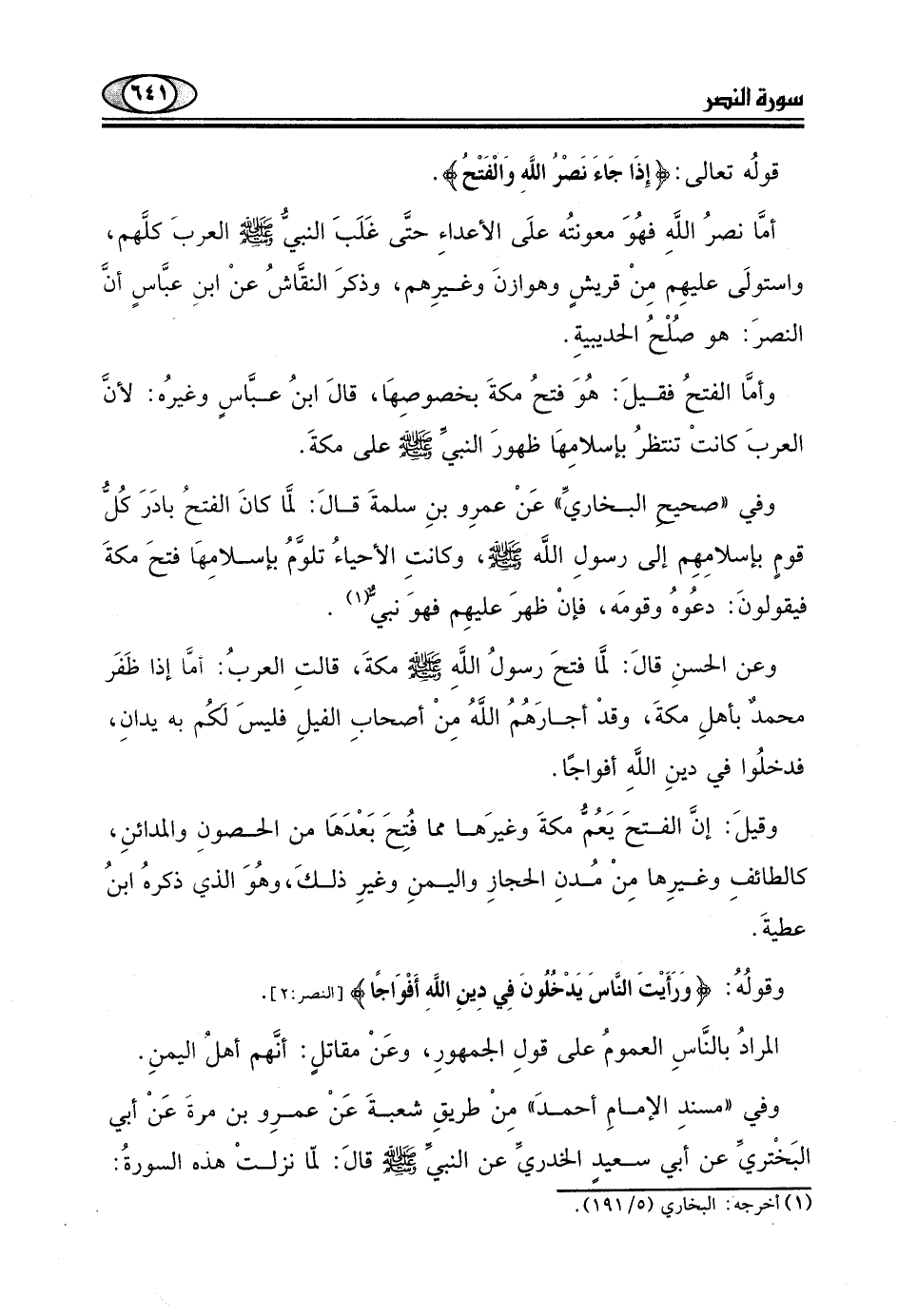 وعن الحسنِ قالَ: لمَّا فتحَ رسولُ اللَّهِ - صلى الله عليه وسلم - مكةَ، قالتِ العربُ: أمَّا إذا ظَفَر محمدٌ بأهلِ مكةَ، وقدْ أجارَهُمُ اللَّهُ مِنْ أصحابِ الفيلِ فليسَ لكم به يدانِ، فدخلُوا في دينِ اللَّهِ أفواجًا.