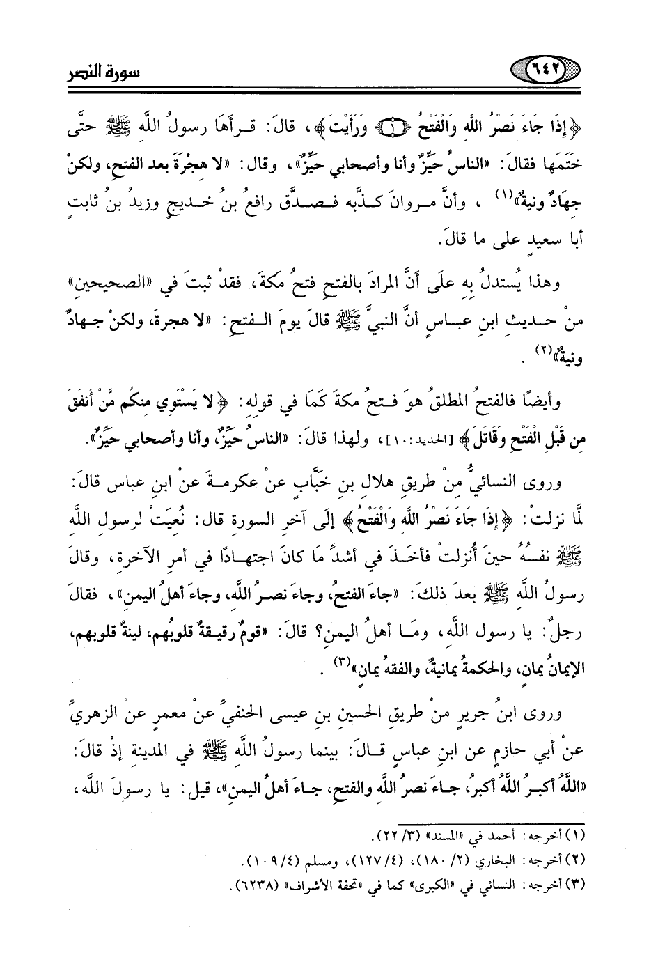 (إِذَا جَاءَ نَصْرُ اللَّهِ وَالْفَتْحُ (1) وَرَأَيْتَ) ، قالَ: قرأَهَا رسولُ اللَّهِ - صلى الله عليه وسلم - حتَّى خَتَمَها فقالَ: "الناسُ حَيِّزٌ وأنا وأصحابي حَيِّزٌ"، وقال: "لا هِجْرَةَ بعد الفتح، ولكنْ جِهَاد ونيَّة".
