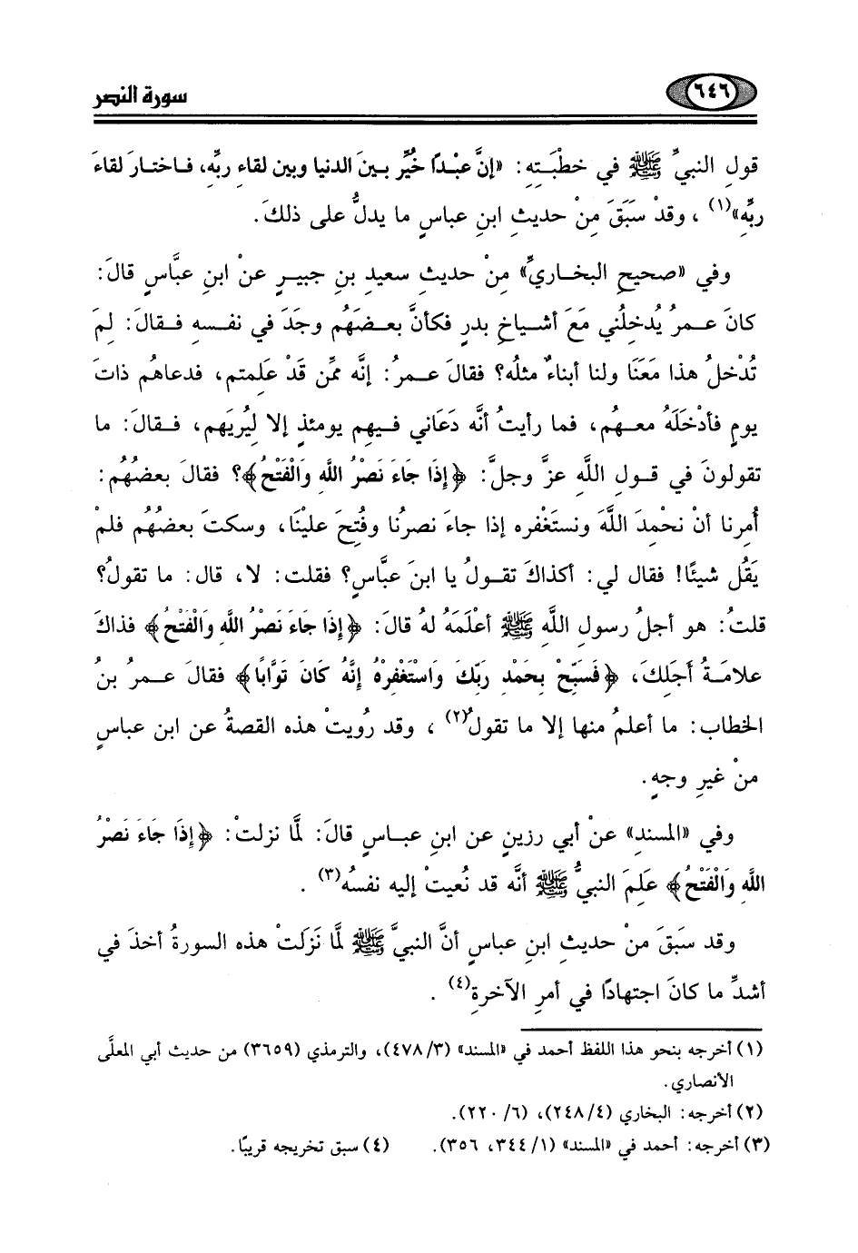 (إِذَا جَاءَ نَصْرُ اللَّهِ وَالْفتحُ) فذاكَ علامَةُ اجَلِكَ، (فَسَبِّحْ بِحَمْد رَبِّكَ وَاسْتَغْفِرْهُ إِنَّهُ كانَ تَوَّابًا) فقالَ عمرُ بنُ الخطاب: ما أعلمُ منها إلا ما تقول وقد رُويتْ هذه القصةُ عن ابن عباسٍ منْ غيرِ وجهٍ.