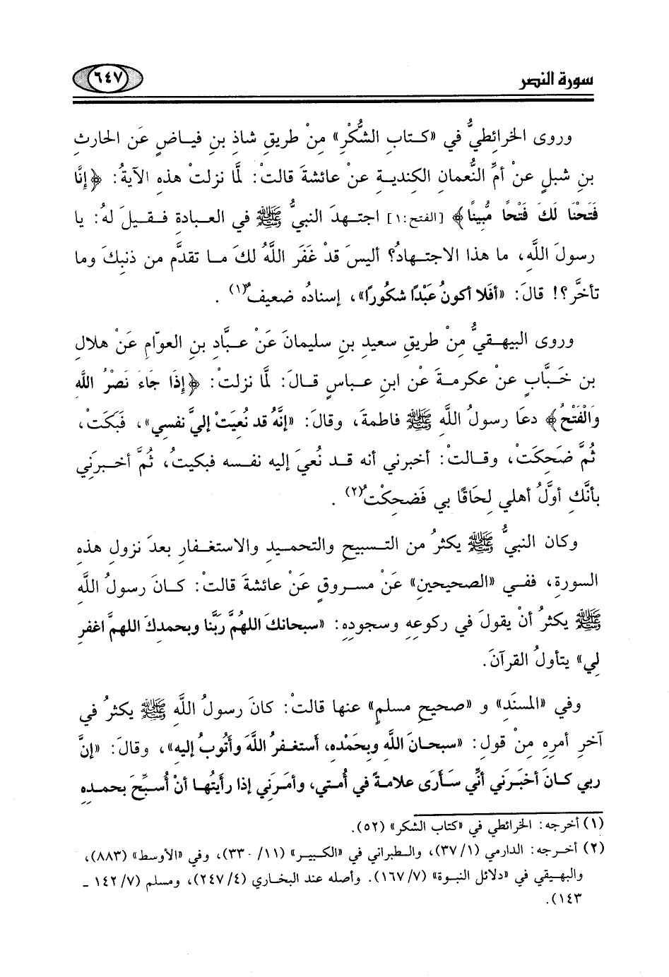 وكان النبيُّ - صلى الله عليه وسلم - يكثرُ من التسبيح والتحميدِ والاستغفارِ بعدَ نزولِ هذهِ السورةِ، ففي "الصحيحينِ " عَنْ مسروقٍ عَنْ عائشةَ قالتْ: كانَ رسول اللَّهِ - صلى الله عليه وسلم - يكثرُ أنْ يقول في ركوعِهِ وسجودِهِ: "سبحانكَ اللهُمَّ رَبَّنا وبحمدِكَ اللهمَّ اغفرِ لِي " يتأول القرآنَ.