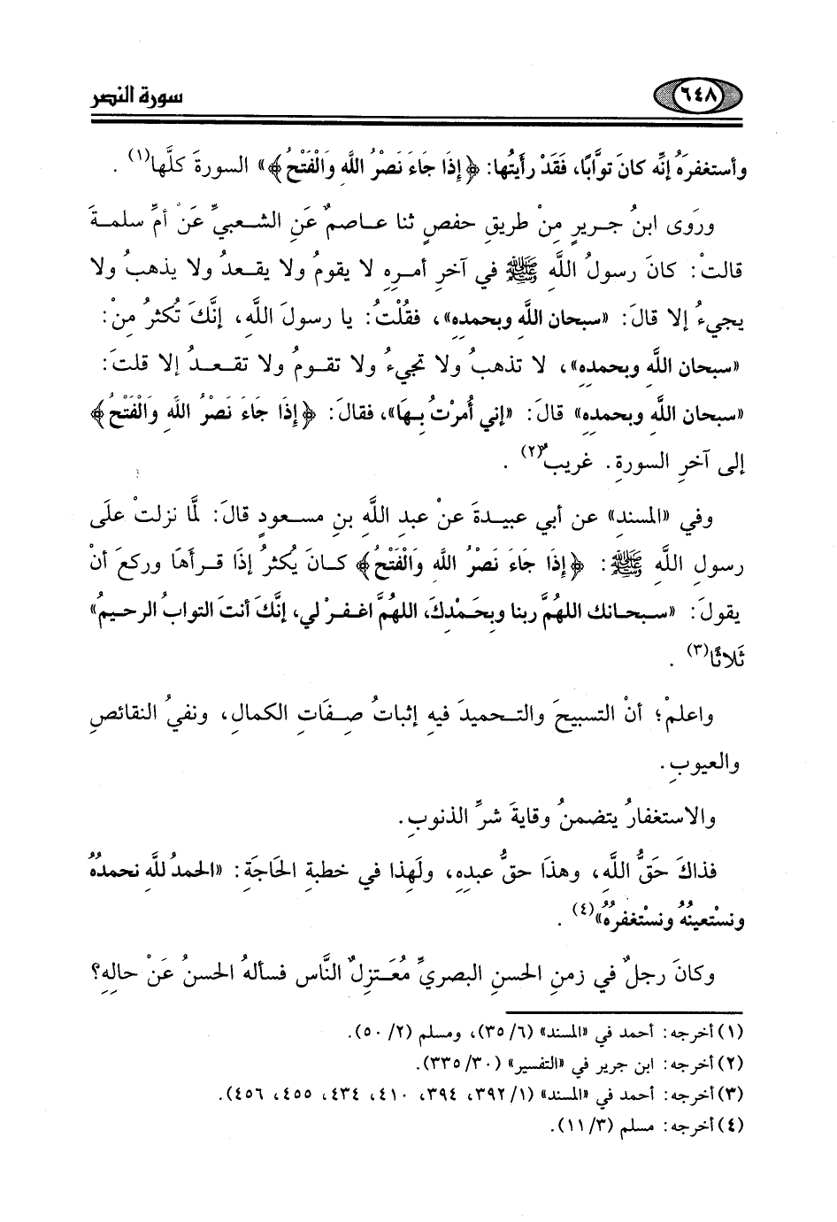 فقالَ: (إِذَا جَاءَ نَصْرُ اللَّهِ وَالْفَتْحُ) إلى آخرِ السورةِ. غريبٌ.