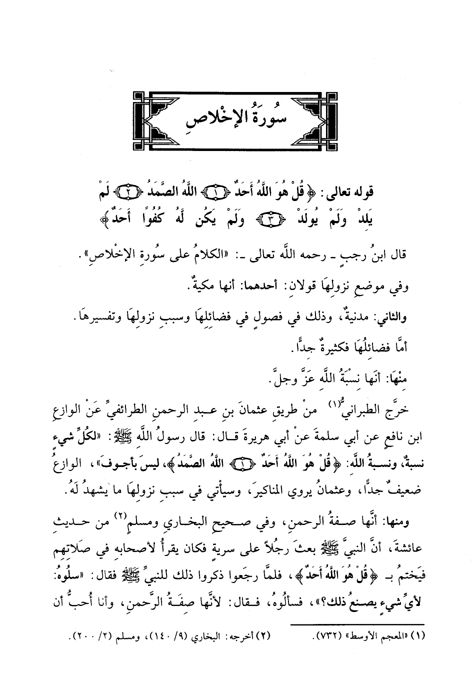 قال ابنُ رجبٍ - رحمه اللَّه تعالى -: "الكلامُ على سُورةِ الإخْلاصِ ".