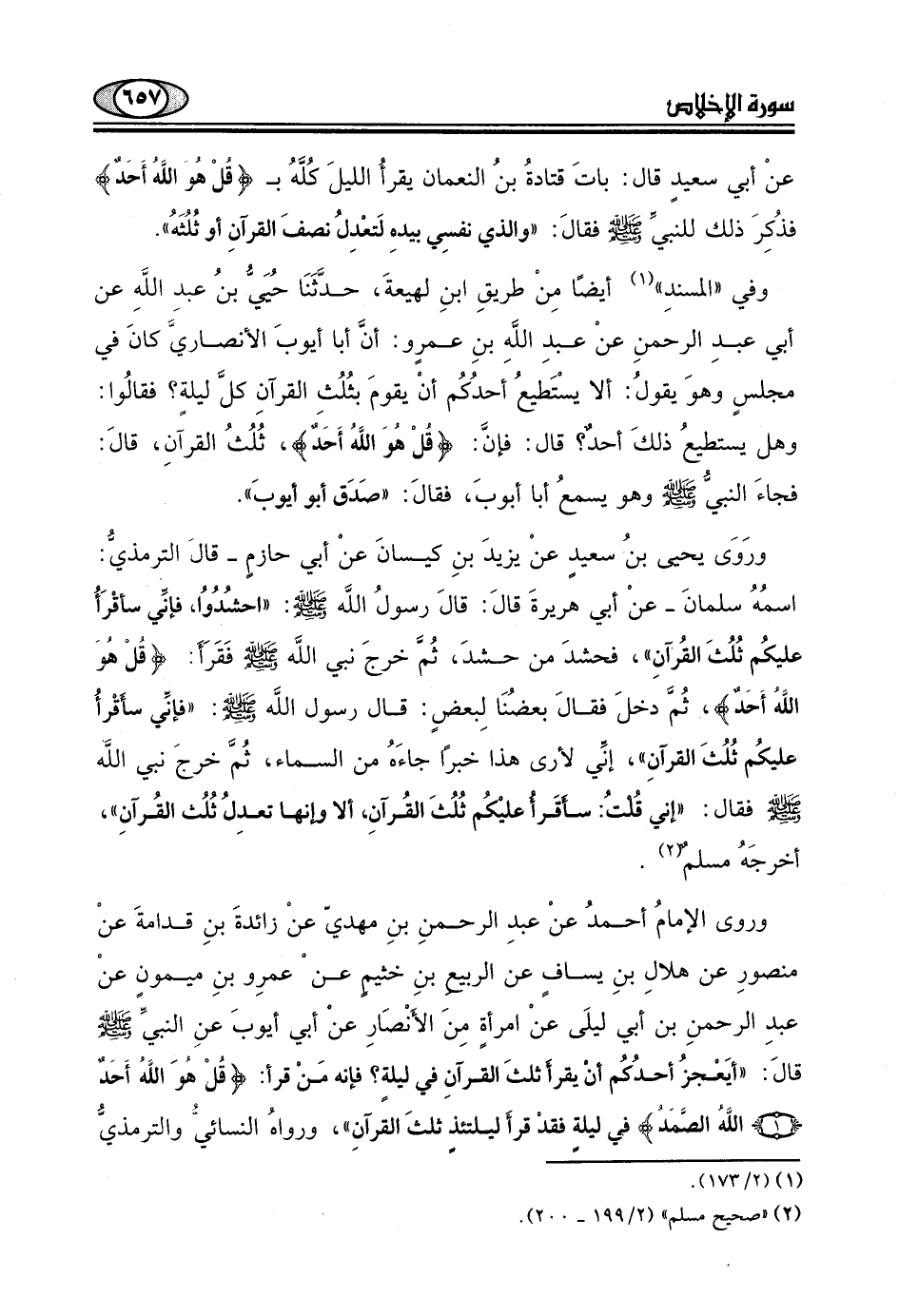 عبدِ الرحمنِ بن أبي ليلَى عنْ امرأةٍ مِنَ الأنْصَارِ عنْ أبي أيوبَ عنِ النبيِّ - صلى الله عليه وسلم - قالَ: "أيَعْجزُ أحدُكُم أنْ يقرأ ثلثَ القرآنِ في ليلةٍ؟ فإنه مَنْ قرأ: (قُلْ هُوَ اللَّهُ أَحَدٌ (1) اللَّهُ الصَّمَدُ) في ليلةٍ فقدْ قرأَ ليلتئذٍ ثلثَ القرآنِ ".