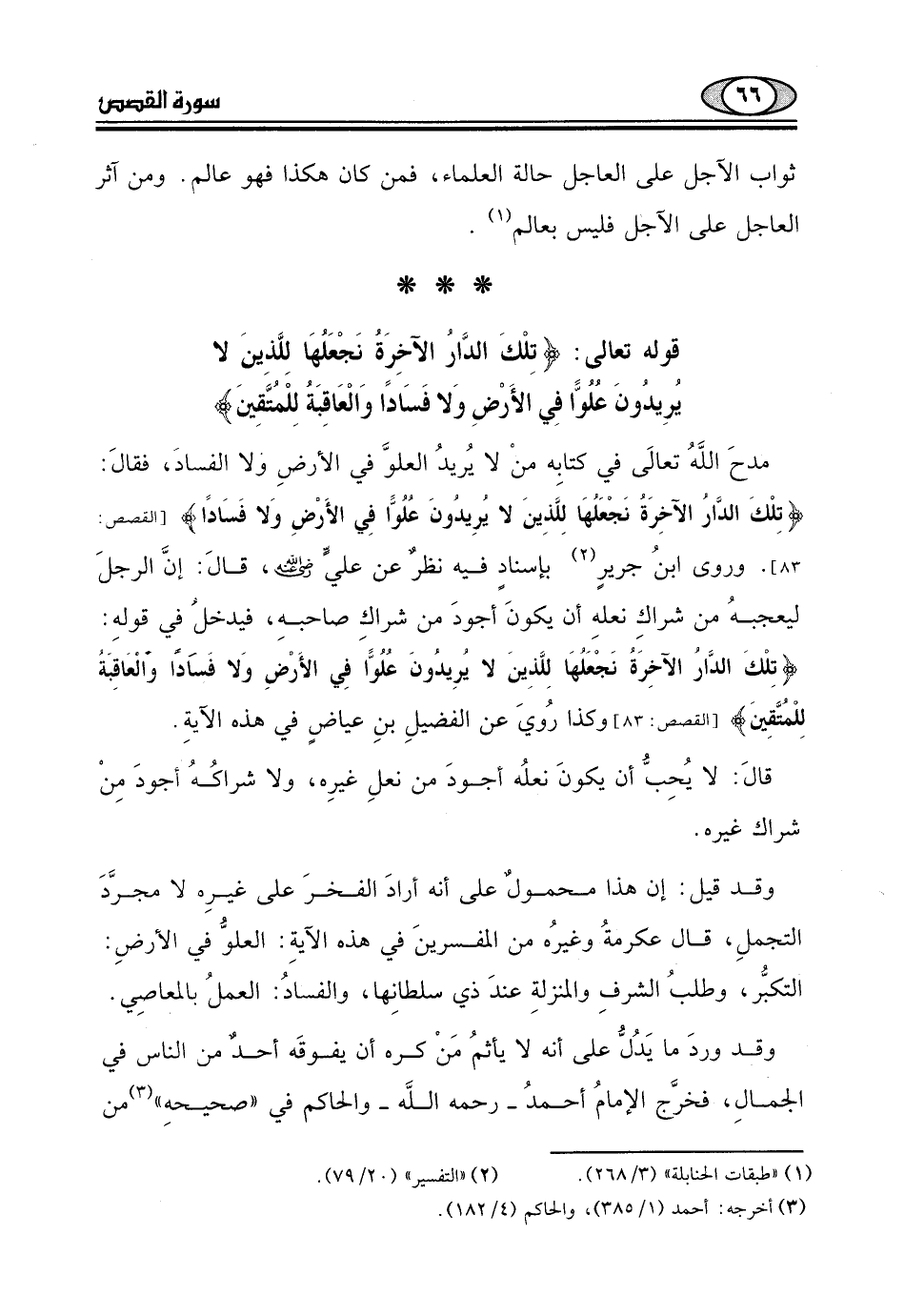 وروى ابنُ جريرٍ بإسنادٍ فيه نظر عن على - رضي الله عنه -، قالَ: إنَّ الرجلَ ليعجبهُ من شراكِ نعلهِ أن يكونَ أجودَ من شراكِ صاحبهِ، فيدخلَ في قولهِ: (تِلْكَ الدَّارُ الْآخِرَةُ نَجْعَلُهَا لِلَّذِينَ لَا يُرِيدُونَ عُلُوًّا فِي الْأَرْضِ وَلَا فَسَادًا وَالْعَاقِبَةُ لِلْمُتَّقِينَ (83) .