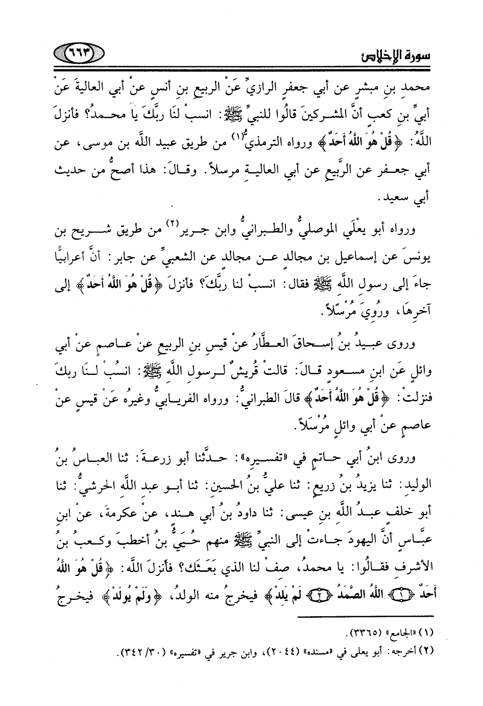وائلٍ عَن ابنِ مسعودٍ قال: قالتْ قُريشٌ لرسول اللَّهِ - صلى الله عليه وسلم -: انسُبْ لنَا ربكَ فنزلتْ: (قُلْ هُوَ اللَهُ أَحَدٌ) قال الطبراني: ورواه الفريابيُّ وغيرُه عَنْ قيسٍ عنْ عاصم عنْ أبي وائلٍ مُرْسَلاً.