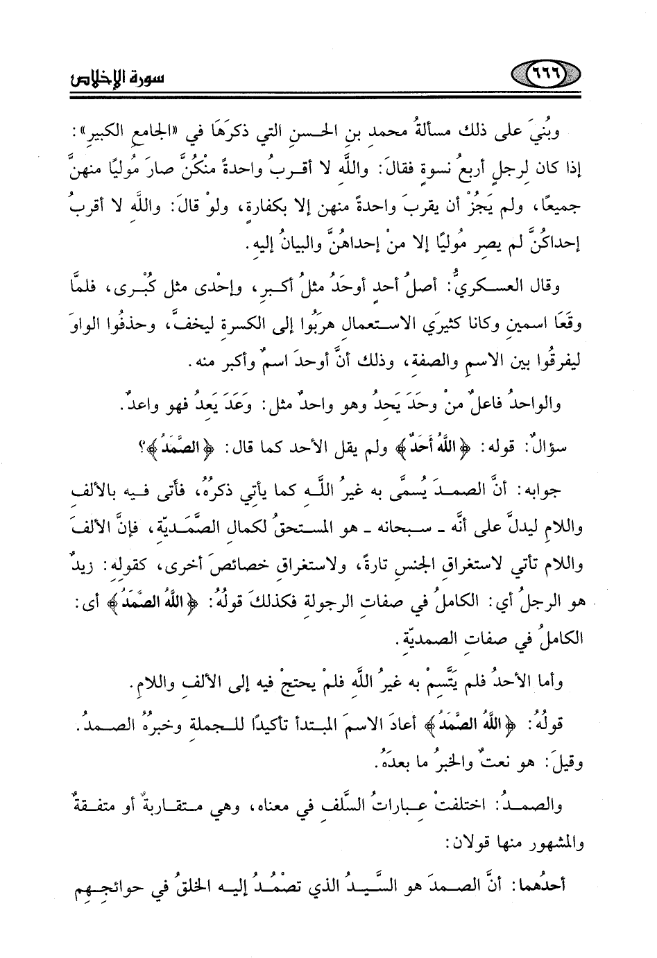 واللام تأتي لاستغراقِ الجنسِ تارةَّ، ولاستغراقِ خصائصَ أخرى، كقولِهِ: زيدٌ هو الرجلُ أي: الكاملُ في صفاتِ الرجولةِ فكذلكَ قولُهُ: (اللَّهُ الصَّمَدُ) أى: الكاملُ في صفاتِ الصمديَّةِ.