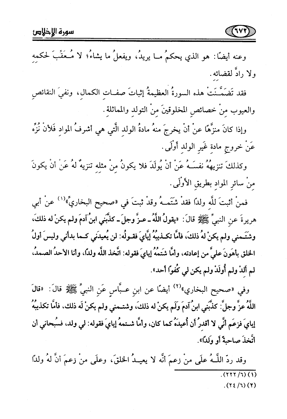 وكذلكَ تنزيهُهُ نفسَهُ عَنْ أنْ يُولَدَ فلا يكونُ مِنْ مثلِهِ تنزيهٌ لهُ عنْ أنْ يكونَ
