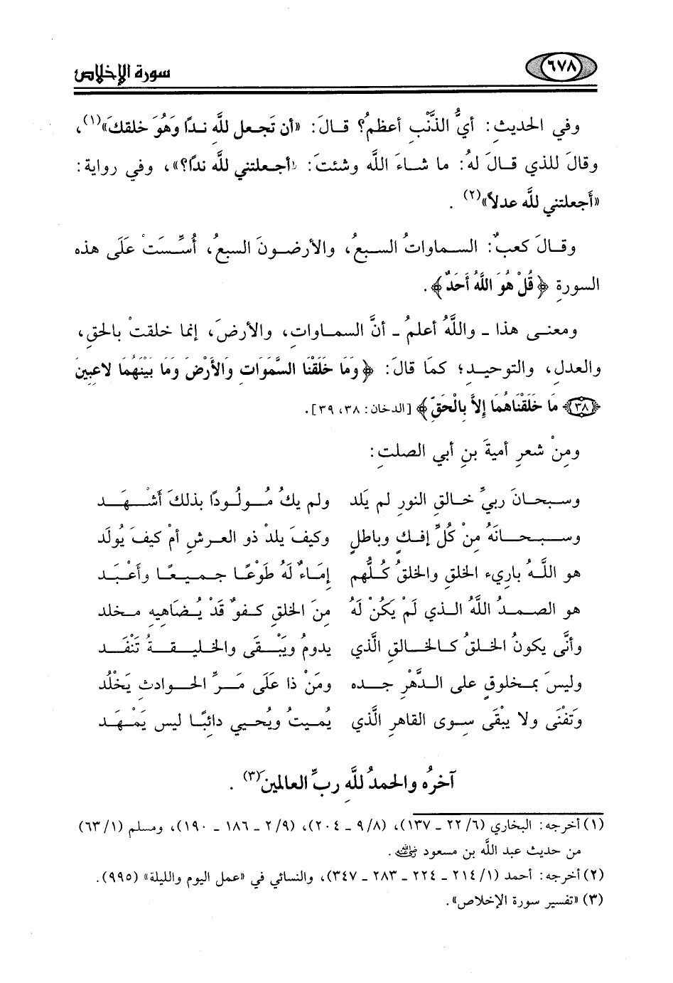 هو الصمدُ اللَهُ الذي لَمْ يكنْ لَهُ. . . مِنَ الخلقِ كفوٌ قَدْ يُضَاهِيه مخلد
